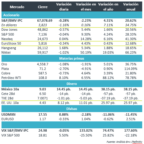 Mañana estar atentos al dato del PIB en México y en EE.UU. El dato de Ingreso personal,  Gasto personal, Deflactor del gasto, Nuevas solicitudes de desempleo y PIB al 1T26.
