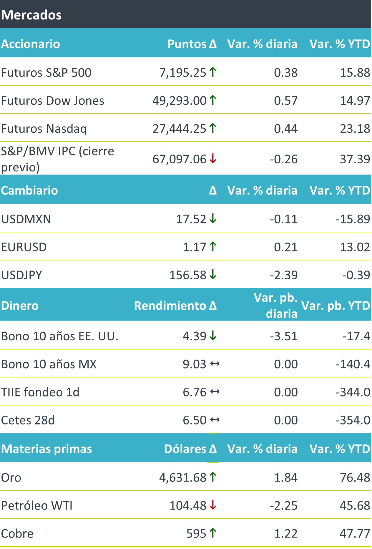 +Los mercados financieros operan con tono positivo, impulsados por el optimismo en torno a la temporada de reportes trimestrales, en particular de algunas de las Siete Magníficas, pese a la persistente incertidumbre geopolítica. Los rendimientos del Treasury a 10 años retroceden ligeramente, aunque se mantienen elevados cerca de 4.42%, tras un mensaje más restrictivo de la Fed al mantener la tasa sin cambios. El dólar muestra un desempeño mixto y el peso mexicano se aprecia marginalmente. En materias primas, el precio del petróleo disminuye, corrigiendo parte de avances recientes, y el oro sube como activo defensivo.