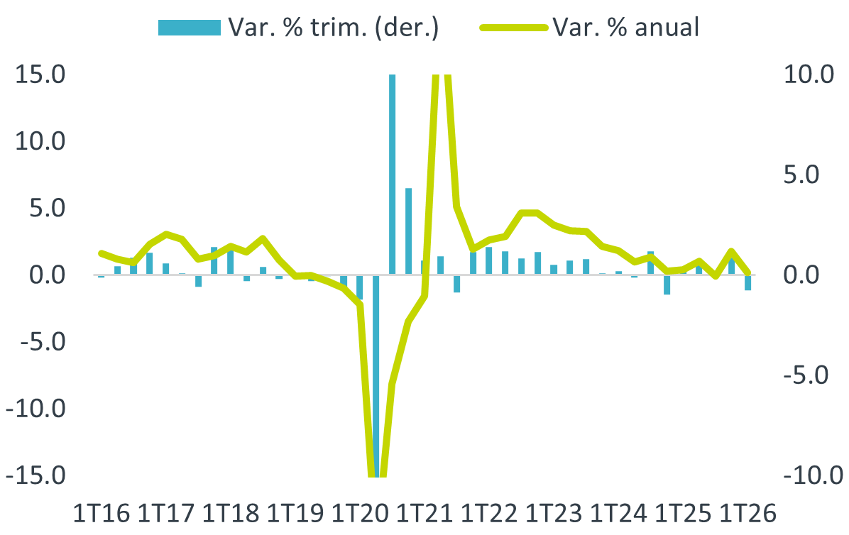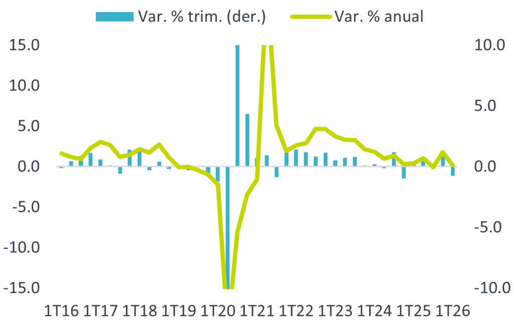 Con cifras originales, el crecimiento del producto se desaceleró de 1.6 a 0.1% a/a. Con cifras desestacionalizadas, la variación anual pasó de 1.8%, máximo de siete lecturas, a 0.2%. La variación trimestral presentó su primer retroceso desde el 4T24, luego del sólido cierre de 2025 (0.9%). Las tres ramas de la actividad presenciaron un regreso contra el trimestre inmediato anterior.