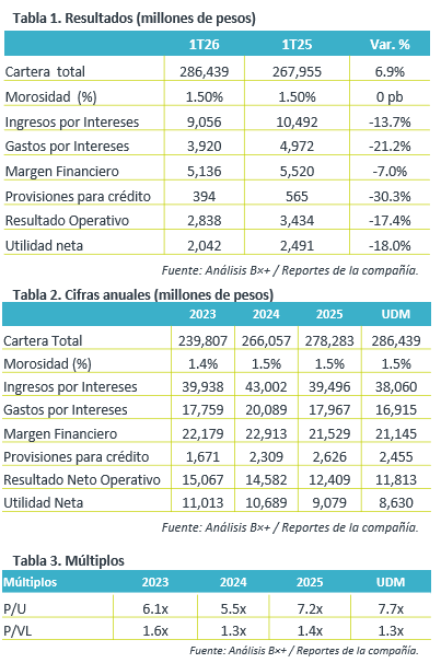 Fondeo. La composición del fondeo al 1T26 fue de depósitos a la vista (40.5%), compuesto de 17.5%% sin costo y 23.0% con costo; depósitos a plazo (42.0%); préstamos interbancarios (15.1%), y reportos (2.4%).